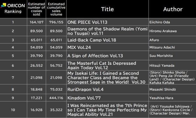 『ONE PIECE』は、最新刊の113巻が引き続き首位をキープしています。今週の売上は164,107部、累計部数は796,155部に達しました。