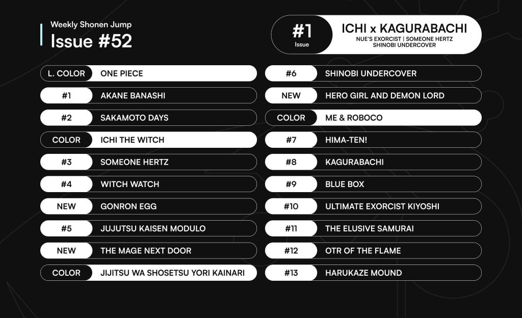 巻頭カラーは、次号の注目作品をプッシュする形で『鵺の陰陽師 (Nue’s Exorcist)』、『忍び事 (Shinobi Undercover)』、そして『サムワンヘルツ (Someone Hertz)』にカラーページが与えられます。