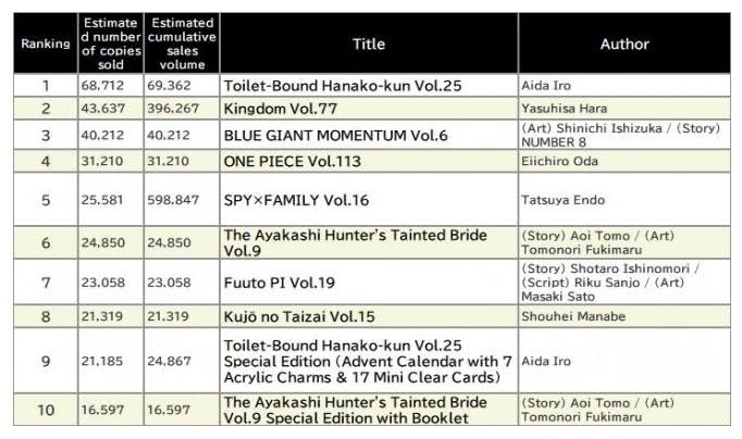 このランキングには、『ONE PIECE』の最新第113巻の発売が含まれており、推定売上部数31,210部で、売上第4位となっています。